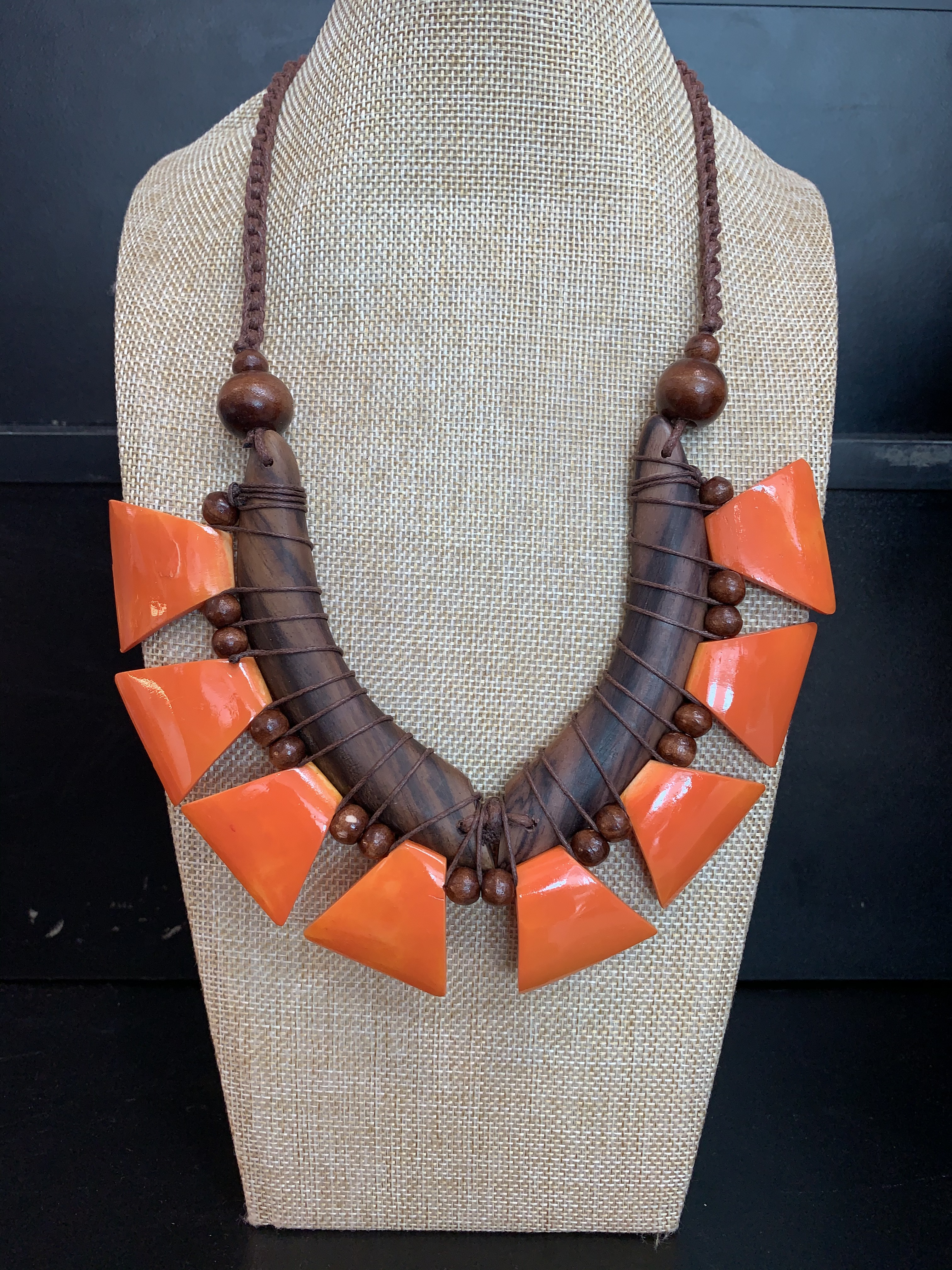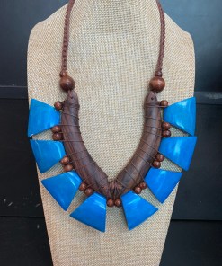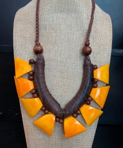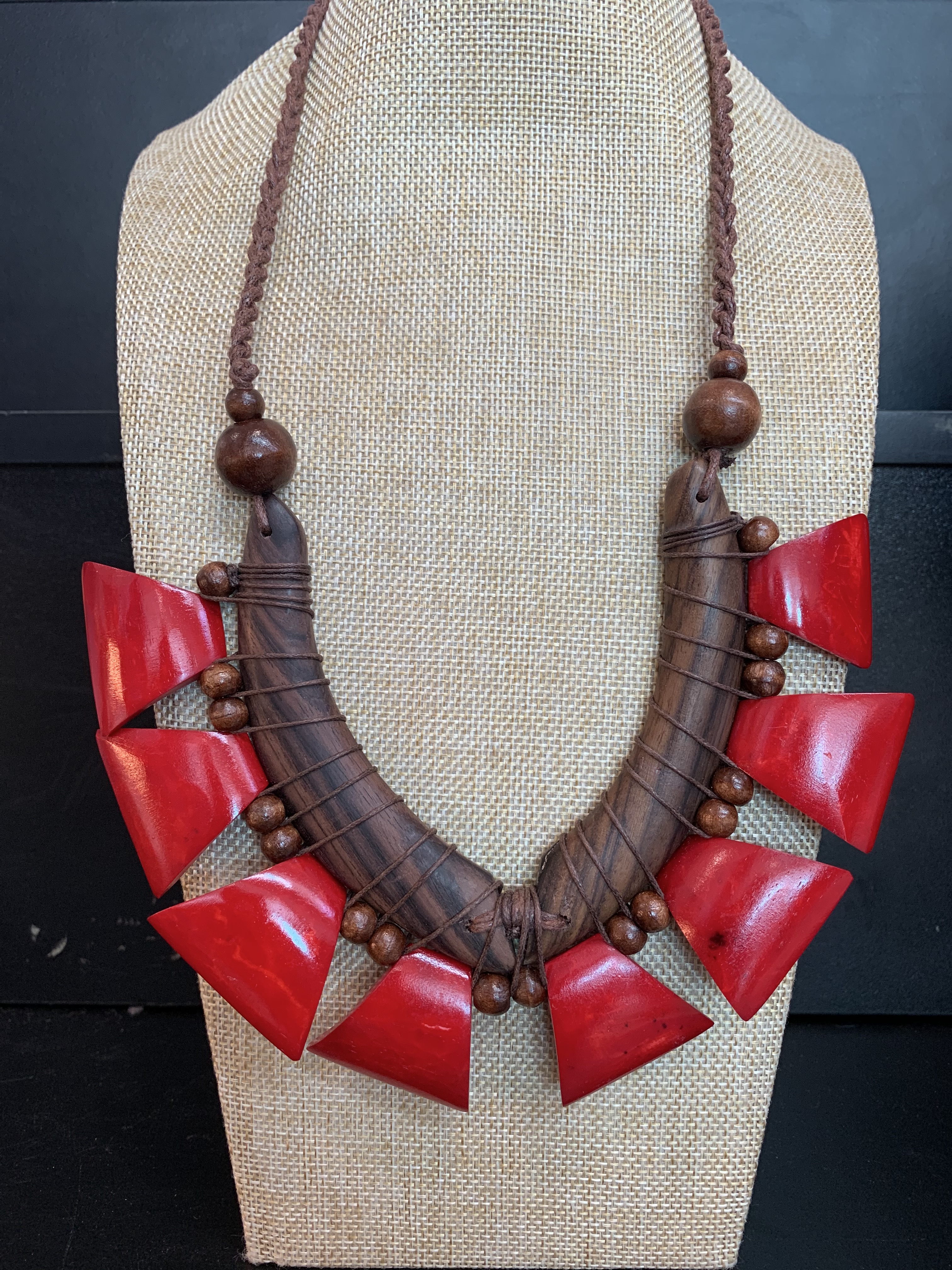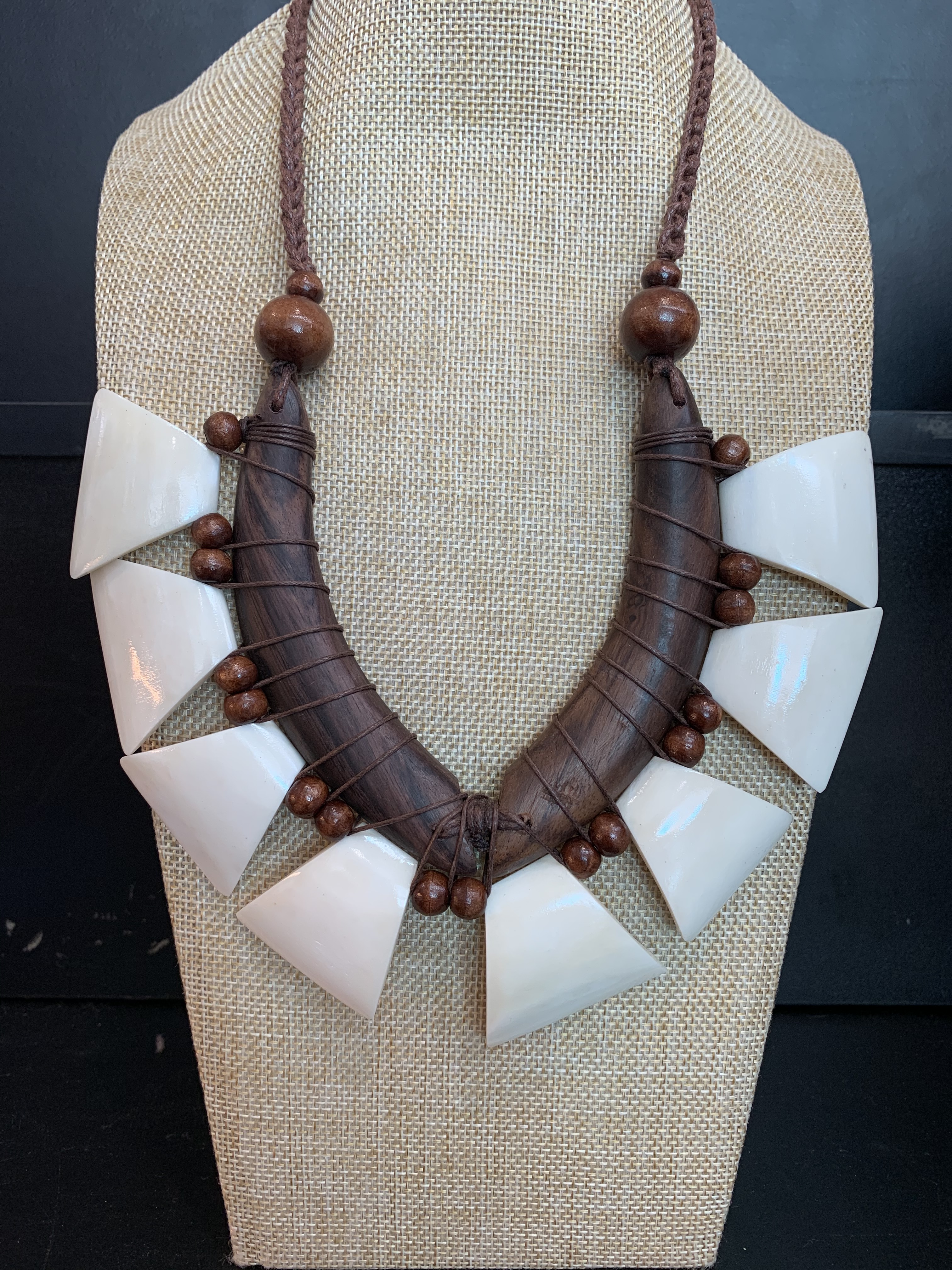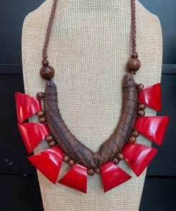 Handmade, natural material, wood, seeds and bone.